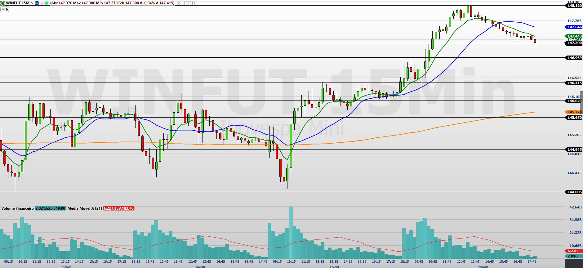 Pelo gráfico de 15 minutos, o mini-índice manteve a alta e mostrou tentativa de retomada da tendência, mesmo ainda negociando abaixo das médias de 9 e 21 períodos. Para que o movimento de alta se firme, será necessário romper a resistência em 147.645/148.120 pontos, o que abriria caminho para 148.540/148.880 pontos, com alvo mais longo em 149.240/149.540 pontos.